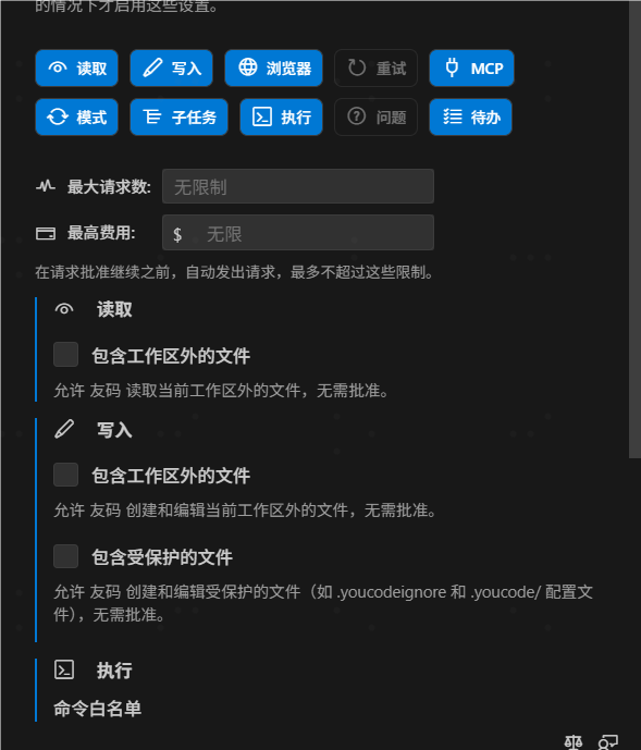 允许 YouCode 自动执行操作而无需批准。仅在您完全信任 AI 并了解相关安全风险的情况下才启用这些设置。