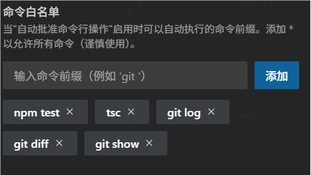 命令管理: “当启用‘始终批准执行操作’时,可以自动执行的命令前缀。添加 * 以允许所有命令(谨慎使用)。”