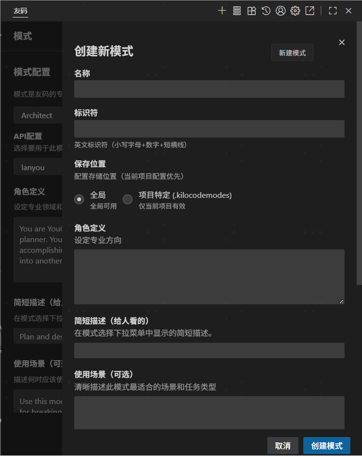 YouCode 允许您创建自定义模式,以根据特定任务或工作流调整 YouCode 的行为。自定义模式可以是全局(适用于所有项目)或项目特定(在单个项目中定义)。