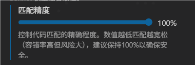 - 100%(默认):需要精确匹配。这是最安全的选择,可最大程度地降低错误更改的风险。