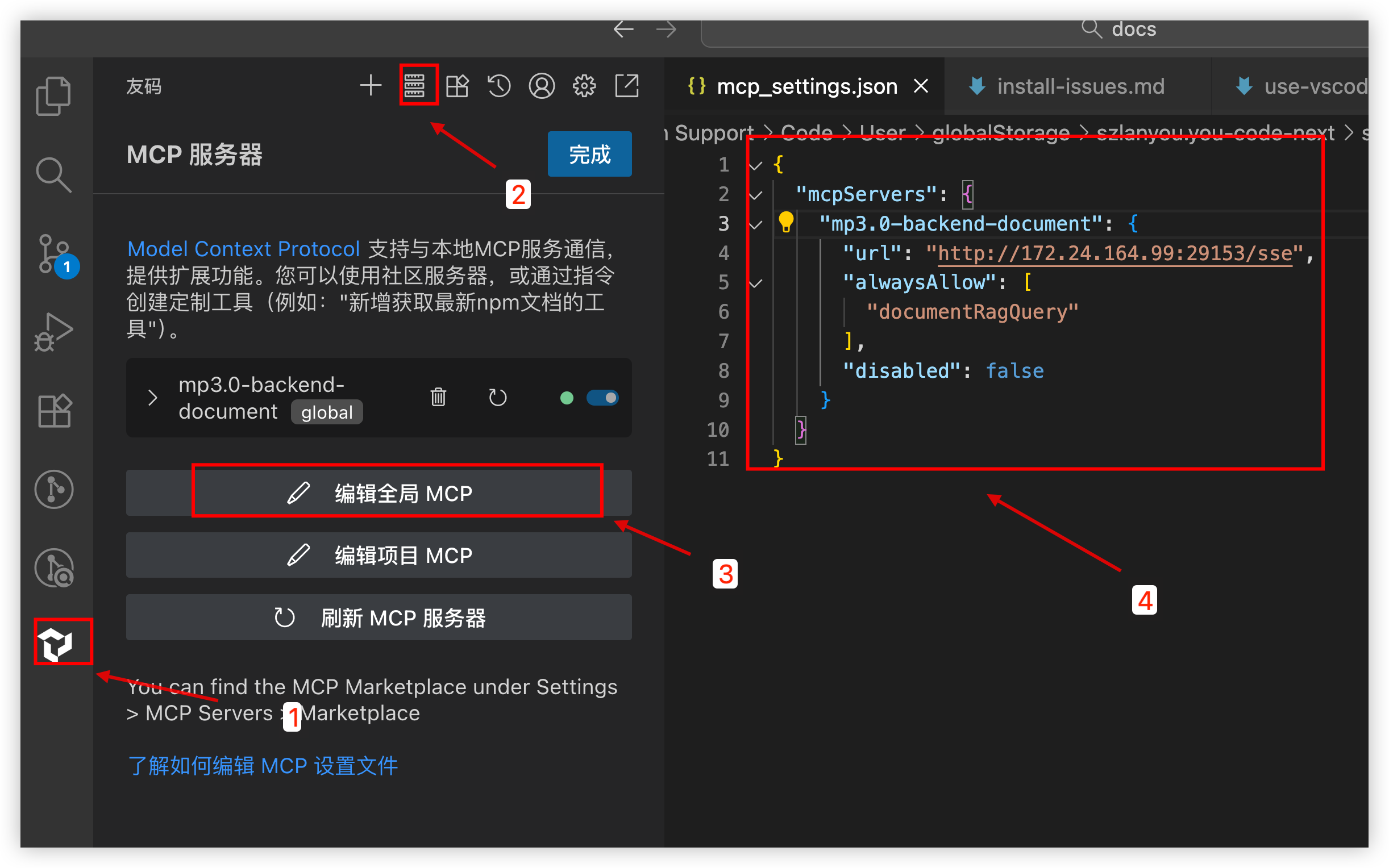 - 打开vscode,打开友码->MCP服务器->编辑全局MCP->编辑->保存