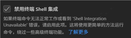 - 缺少 shell 集成标记可能需要调整设置,以解决与 shell 初始化和 VSCode 加载特殊 shell 集成钩子相关的上游 bug 或本地工作站配置问题。