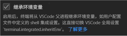启用后,终端将从 VSCode 父进程继承环境变量,如用户配置文件中定义的 shell 集成设置。这直接切换 VSCode 全局设置 terminal.integrated.inheritEnv。