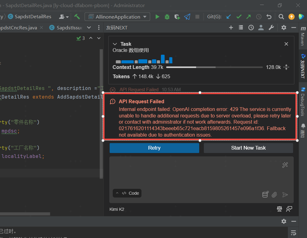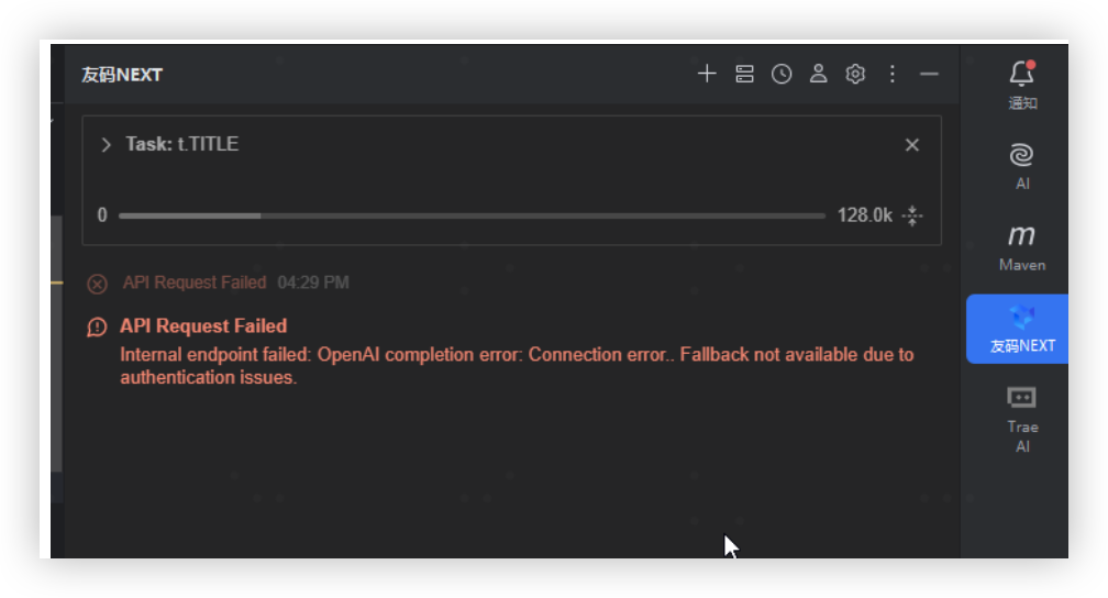 对话后显示API Request FailedInternal endpoint failed: OpenAI completion error: Connection error..