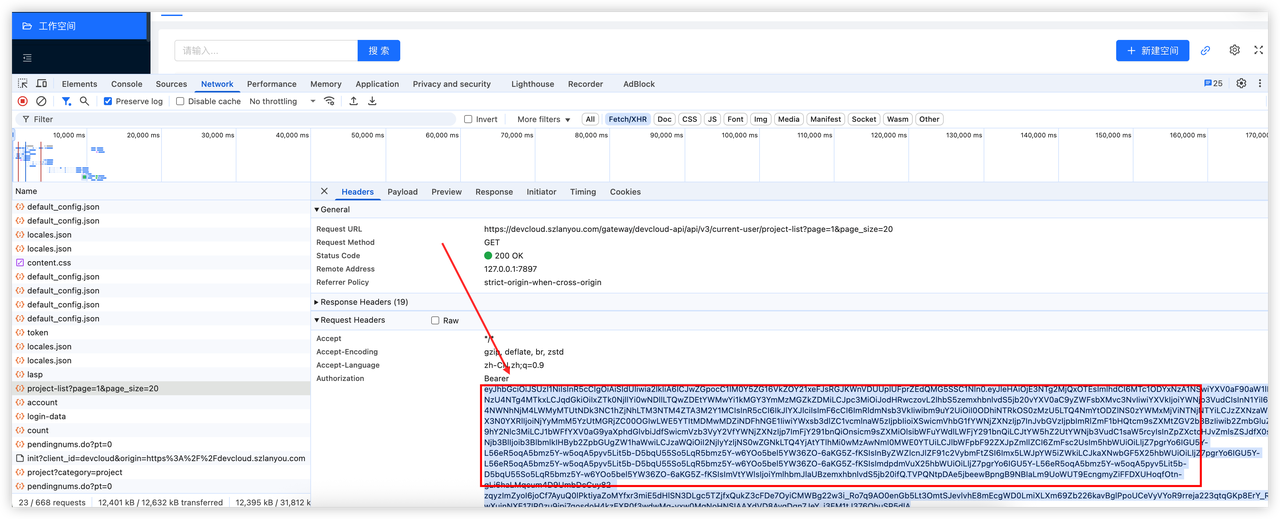 - 点击后,可以在调试页面看到对应的token信息,拷贝下来,不要带 "Bearer" 只获取后面即可