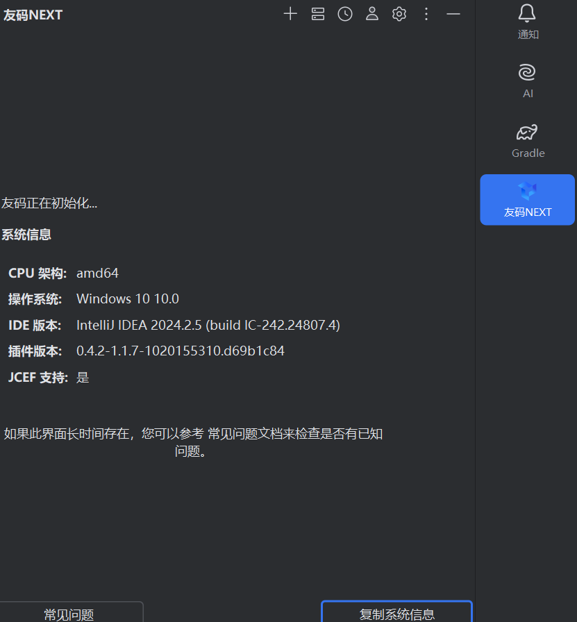 IDEA打开友码NEXT后,一直显示友码正在初始化