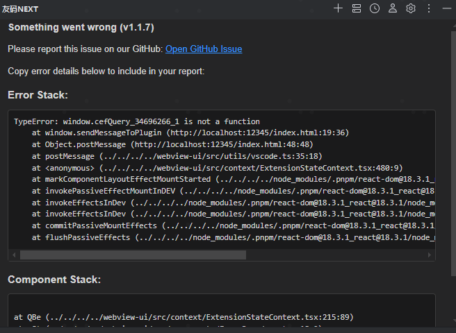 Please report this issue on our GitHub: Open GitHub IssueCopy error details below to include in your report:Error Stack:TypeError: window.cefQuery_34696266_1 is not a functionat window.sendMessageToPlugin (http://localhost:12345/index.html:19:36)at Object.postMessage (http://localhost:12345/index.html:48:48)at postMessage (../../../../webview-ui/src/utils/vscode.ts:35:18)at <anonymous> (../../../../webview-ui/src/context/ExtensionStateContext.tsx:480:9)at markComponentLayoutEffectMountStarted (../../../../node_modules/.pnpm/react-dom@18.3.1_react@18.3.1/node_modules/react-dom/cjs/react-dom.development.js:25352:18)at invokePassiveEffectMountInDEV (../../../../node_modules/.pnpm/react-dom@18.3.1_react@18.3.1/node_modules/react-dom/cjs/react-dom.development.js:27404:13)at invokeEffectsInDev (../../../../node_modules/.pnpm/react-dom@18.3.1_react@18.3.1/node_modules/react-dom/cjs/react-dom.development.js:29657:11)at invokeEffectsInDev (../../../../node_modules/.pnpm/react-dom@18.3.1_react@18.3.1/node_modules/react-dom/cjs/react-dom.development.js:29666:11)at commitPassiveMountEffects (../../../../node_modules/.pnpm/react-dom@18.3.1_react@18.3.1/node_modules/react-dom/cjs/react-dom.development.js:29638:9)at flushPassiveEffects (../../../../node_modules/.pnpm/react-dom@18.3.1_react@18.3.1/node_modules/react-dom/cjs/react-dom.development.js:29497:11)