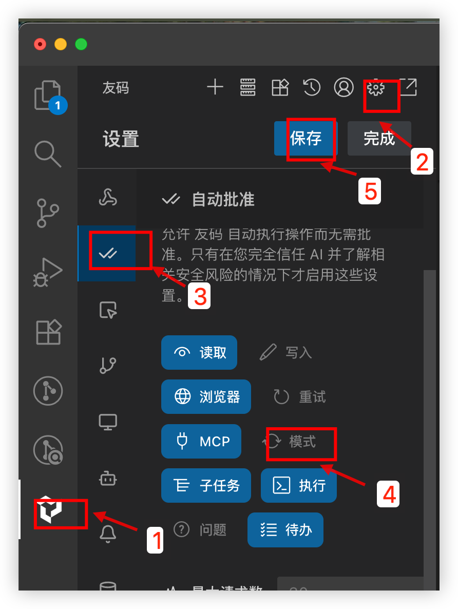 - 在自动批准启动中,点击按钮模式可以开关模式切换功能