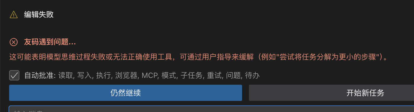使用时出现友码遇到问题…这可能表明模型思维过程失败或无法正确使用工具,可通过用户指导来缓解(例如 "尝试将任务分解为更小的步骤")。